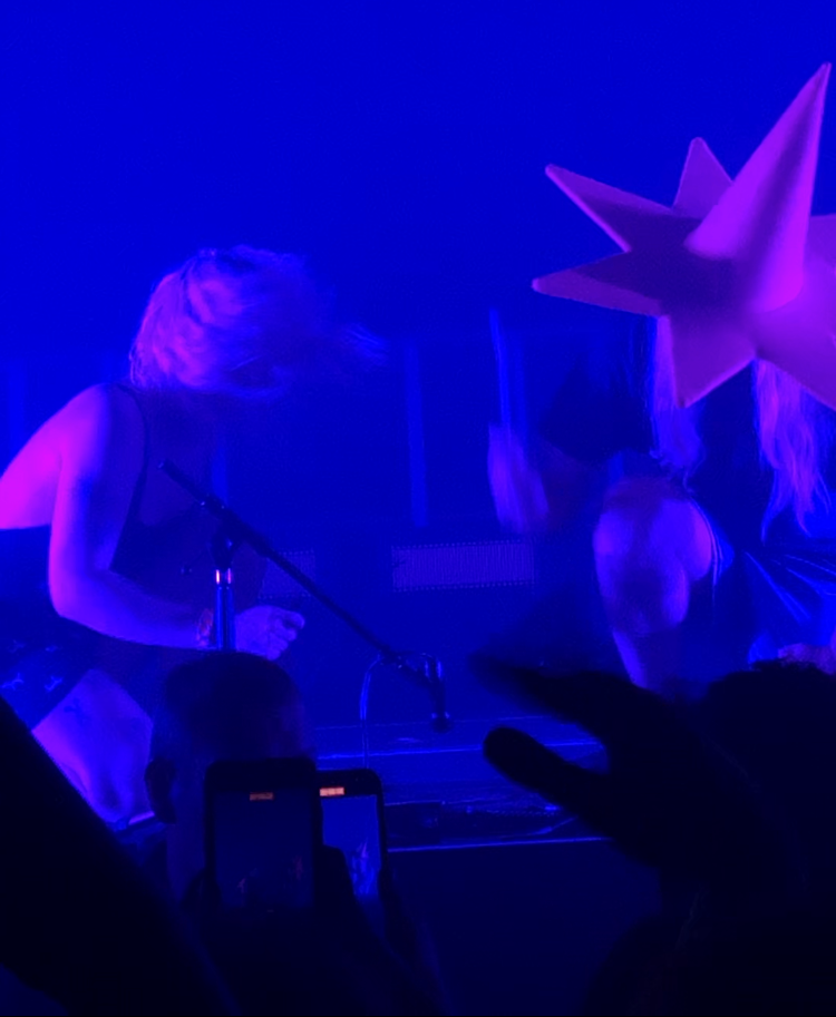 Seconds after 9 pm, the stage is lit-up as two equally lanky, bleach blondes ascend onto the warehouse stage to the backing of an industrial rock-inspired track with screeching distorted vocals, titled “Hey Big Man”. This new track off the upcoming sophomore album “10000 gecs” has the crowd throwing itself around already without even knowing the words. There is no time to settle as Les spits the opening words of “stupid horse” onto the front row. A notable song from the group, the crowd turns into more of a joyful mob as gambling is critiqued over blown-out guitar riffs and exaggerated auto-tune singing.